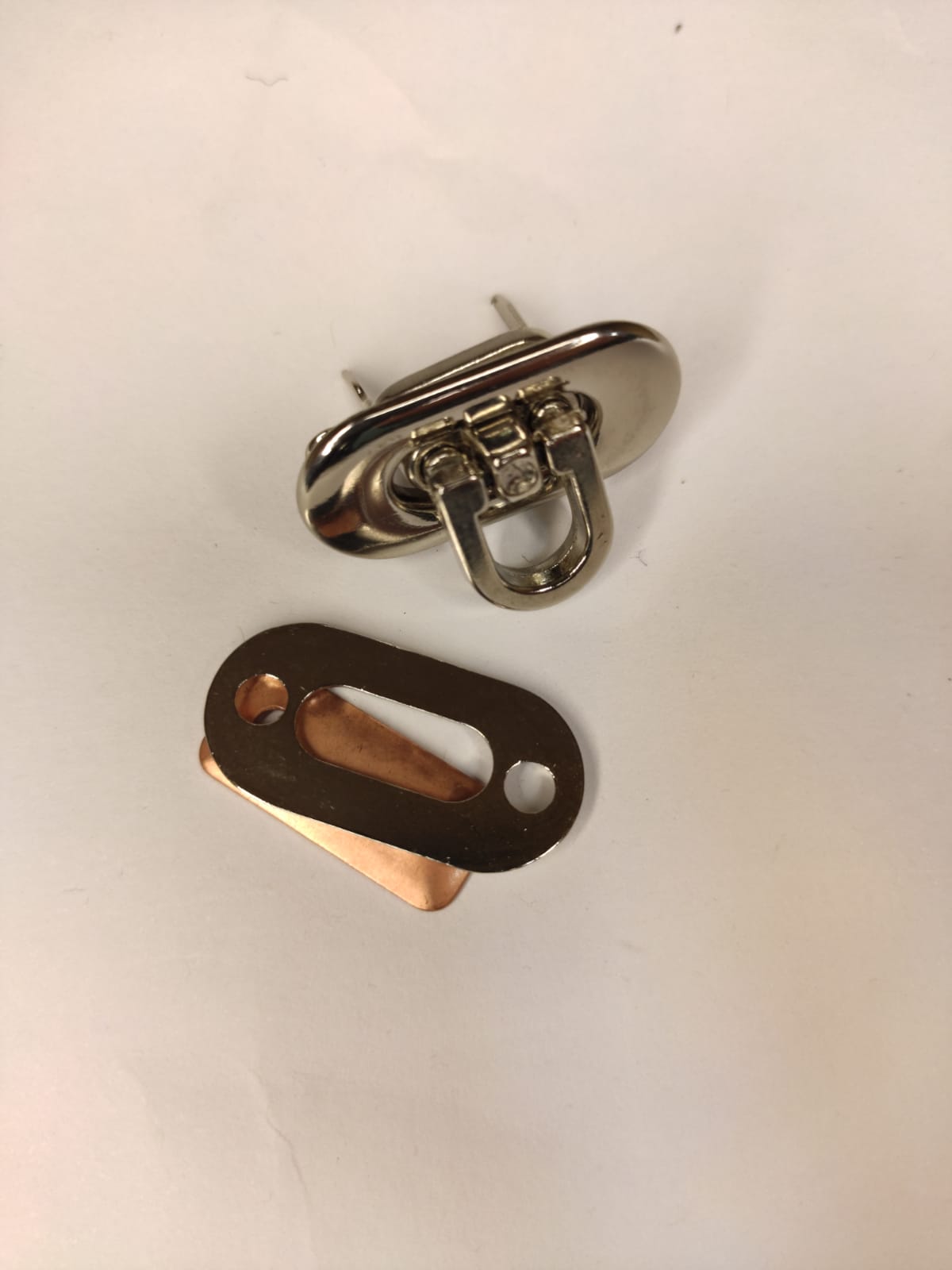 O fecho é composto por 5 peças: base, fecho, peça de segurança (trava) e 2 parafusos.